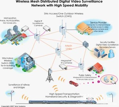组建视频监控系统,无线网络技术是必不可少的技术之一。Strix无线mesh网状网络系统,能够实现大规模的无线监控网络。与有线监控不同的是,无线mesh网状网络同时也能够承载无线采集和无线语音等其他业务,是综合性的多业务平台。无线mesh 网状网系统具有在网络节点间进行快速切换的特点,可以为高速移动环境下的部署网络提供高效可靠的解决方案,这样也使高速移动下的移动视频监控成为可能。