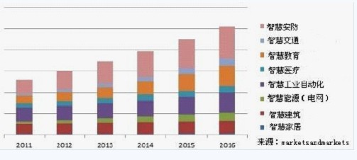 据报告发现,智慧城市在2011年的整体市值为5263亿美元,预计2016年将翻一番达到10234亿美元,2011-2016年的年复合增长率将达到14.2%。报告指出,智慧能源(管理)将成为智慧城市所有应用领域中市场发展最迅猛的一环,2016年预计其年复合增长率将达到28.7%,市值将扩大到807亿美元。