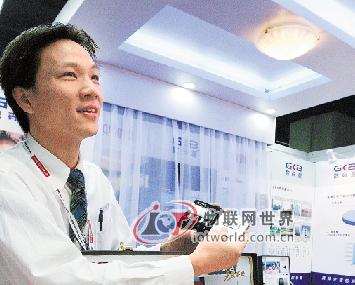 一家智能家居集成系统的企业工作人员在向参观者作介绍,他们的产品能通过遥控器甚至手机、网络实现对家里电器的开关。