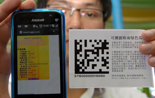 5月10日上午,海南省瓜菜质量安全田头监管3G系统示范推广现场会在海南省屯昌县召开。这项监管系统是海南省“十二五”开局之年重点推广的民生工程,由海南省农业厅、新华社海南分社、中国移动海南公司以现代物联网技术实现的现代化农业管理系统,通过标准化、组织化生产和建立行之有效的预警监测制度、追溯制度,实现监管部门对全省瓜菜质量安全的全过程监管。工作人员在展示对瓜菜进行溯源的结果。溯源结果包括产品名称、蔬菜等级、生产厂商、施肥记录、用药记录等信息,首批有二维码标识的可溯源瓜菜正从海南省屯昌县枫木镇枫绿果蔬产销专业合作社运往市场。随着一车贴有二维码标签的苦瓜从海南省屯昌县启运出岛,标志着海南瓜菜从此有了“身份证”,海南利用先进信息化技术手段监管瓜菜生产取得实质性进展。