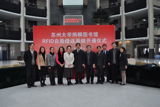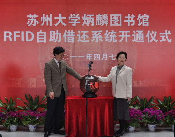 4月7日下午,苏州大学炳麟图书馆RFID自动借还系统开通仪式在该馆二楼大厅隆重举行。苏州大学副校长田晓明教授、台湾东吴大学图书馆丁原基馆长、东吴大学文学院历史学系林慈淑主任、东吴大学图书馆非书资料组胡佳薇主任、苏州图书馆许晓霞副馆长、常熟理工学院图书馆张幼良馆长、海恒公司总经理方克林先生、苏州大学图书馆罗时进馆长等出席了开通仪式。开通仪式由图书馆党委书记孙庆民主持。