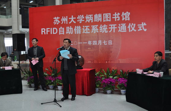 罗时进在致辞中向与会嘉宾和师生介绍了苏州大学图书馆的百年发展史,以及炳麟图书馆RFID系统建设情况。他指出,苏州大学图书馆RFID项目是我校“211工程”数字图书馆建设的标志性项目之一,为了能够科学、有效地推进这一工程,经过一年多的详细调研和严密论证,最终确定在炳麟图书馆实施一期工程。这也是目前江苏省内第一家使用HF-RFID的大学图书馆,在全国高校也具有创新性使用的意义。RFID自助借还系统的开通,标志着我校在向高等学校图书馆数字化、智能化管理方向又迈出了崭新的一步。
