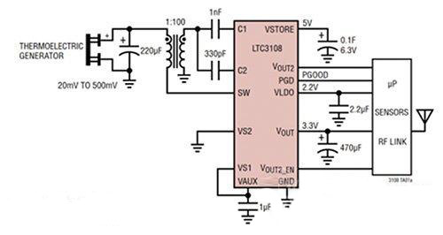 另一方面,LTC3108 是一款可用于热电发电机的超低电压 DC/DC 升压转换器。这种升压型拓扑结构的输入电压可低至 20mA 并采用一个 2.2 V LDO 向外部处理器供电,而主输出则经过编程后用作四个固定电压中的一个,向无线链路供电。储能电容器在没有输入电压源时提供电能,这种设计可确保输出存储电容器快速充电,以使供电平稳。