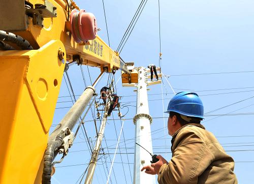 3月13日,国家电网山东即墨供电公司职工在进行线路改造作业。据国家电网山东电力集团消息,2013年山东省将加大电网建设力度,全年新建智能化变电站107座,年内将实现智能电网市县全覆盖。智能电网的进一步普及将大大缩短用户停电时间。