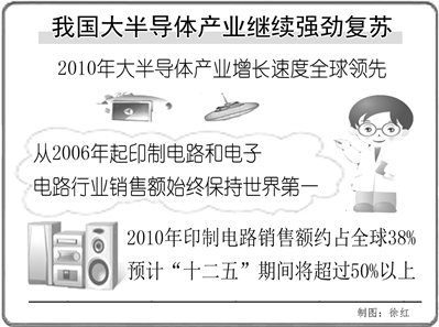 2010年我国大半导体产业继续强劲复苏,增长速度领跑全球。“从2006年起中国的印制电路和电子电路行业的销售额始终保持世界第一。2010年我国印制电路销售额约占全球38%,预计‘十二五’期间将超过50%以上。”中国印刷电路行业协会秘书长王龙基说。