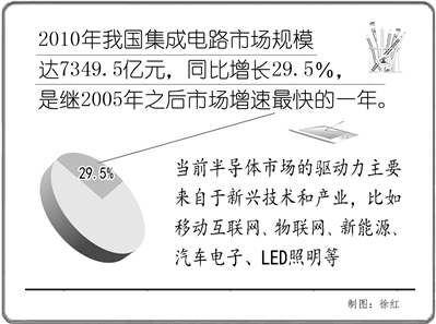 中国半导体行业协会日前发布的统计数据显示,2010年中国集成电路市场规模达7349.5亿元,同比增长29.5%,是继2005年之后市场增速最快的一年。