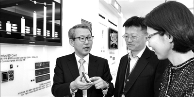 三星是内存行业首家使用30纳米级技术生产这种内存芯片的厂商,新型芯片比以前的芯片生产效率提高了大约60%。图为三星半导体总裁全东守介绍三星推出的绿色存储产品。 积 凯摄